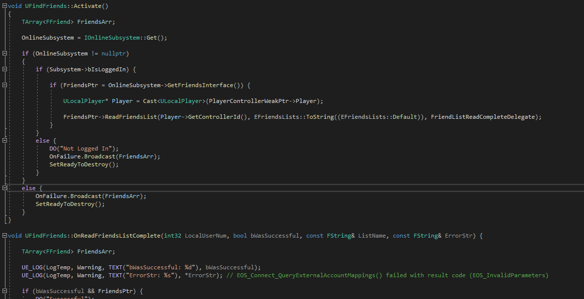 现在使用EOS进行测试,我现在已经用蒸汽和EOS (就像测试一样)登录,我的蒸汽帐户链接到我的epic games帐户,但是当我用下面的代码调用ReadFriendsList api时(以及这些代码的许多变体以确保它不仅仅是我)