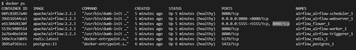 8915e4fb4ffe airflow_2_flower "/usr/bin/dumb-init …" About an hour ago Up 52 minutes (healthy) 0.0.0.0:5555->5555/tcp, :::5555->5555/tcp, 8080/tcp airflow_2_flower_1
