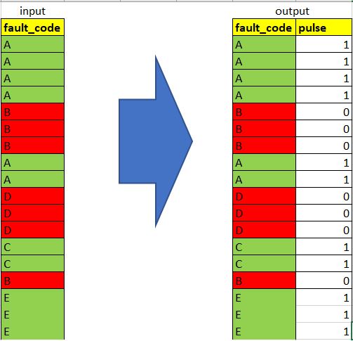 df['pulse'] = df['fault_code'].isin(['B', 'D']).rsub(1)产出: