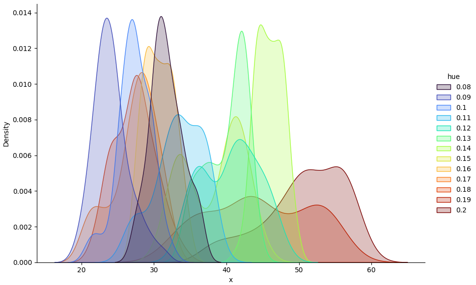 g = sns.displot(df, x='x', hue='hue', palette='turbo', kind='kde', fill=True, height=6, aspect=1.5)