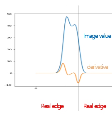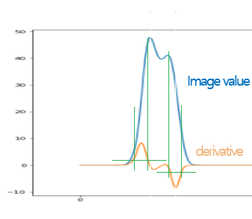 我试着用python检测边缘。有数以百计的边缘检测算法,然而,图像非常模糊和不清晰。最严重的问题是一条边位于局部最大值,而另一条边位于局部最大值处。通过详细的考察,我发现另一条边缘位于原值的拐点之一。我把这种情况描述为一个简单的情况。