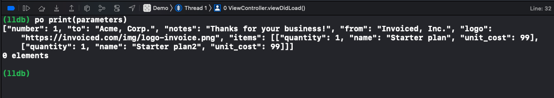 let parameters = JSONParameters(from: "Invoiced Inc.", to:......) // Complete object