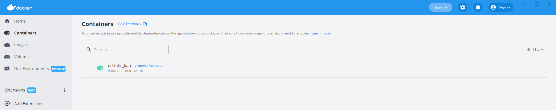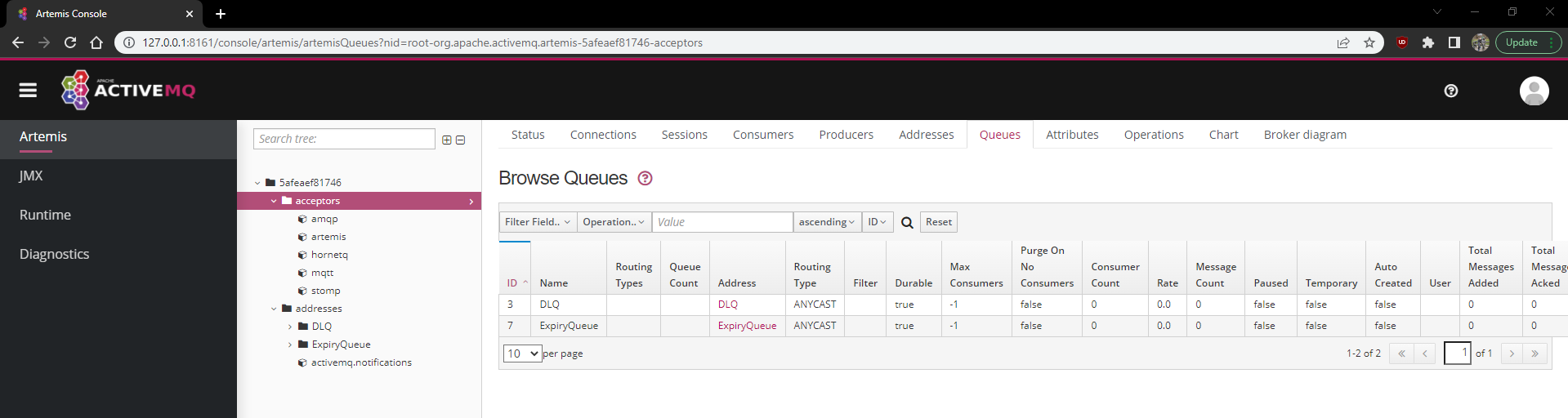 C:\Users\Miljan>docker run -it --rm -p 8161:8161 -p 61616:61616 vromero/activemq-artemis在运行映像之前,我必须下载图像,我可以看到服务器正在运行:
