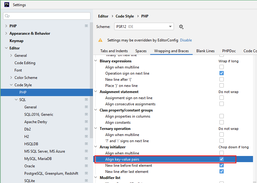 File | Settings (PhpStorm | Preferences on macOS)Editor | Code Style | PHPWrapping and Braces tabArray initializer | Align key-value pairs option)