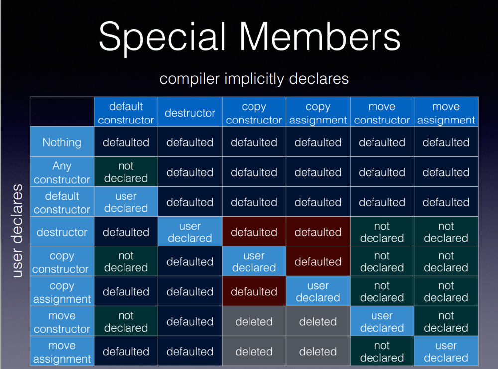 在表的左边,如果您自己声明其中的一些,那么其他特殊成员函数会发生什么。对于特殊的成员函数,可以在类定义中编写实现,或者说= delete或= default。该表显示编译器隐式声明为默认值或已删除的其他哪一个。