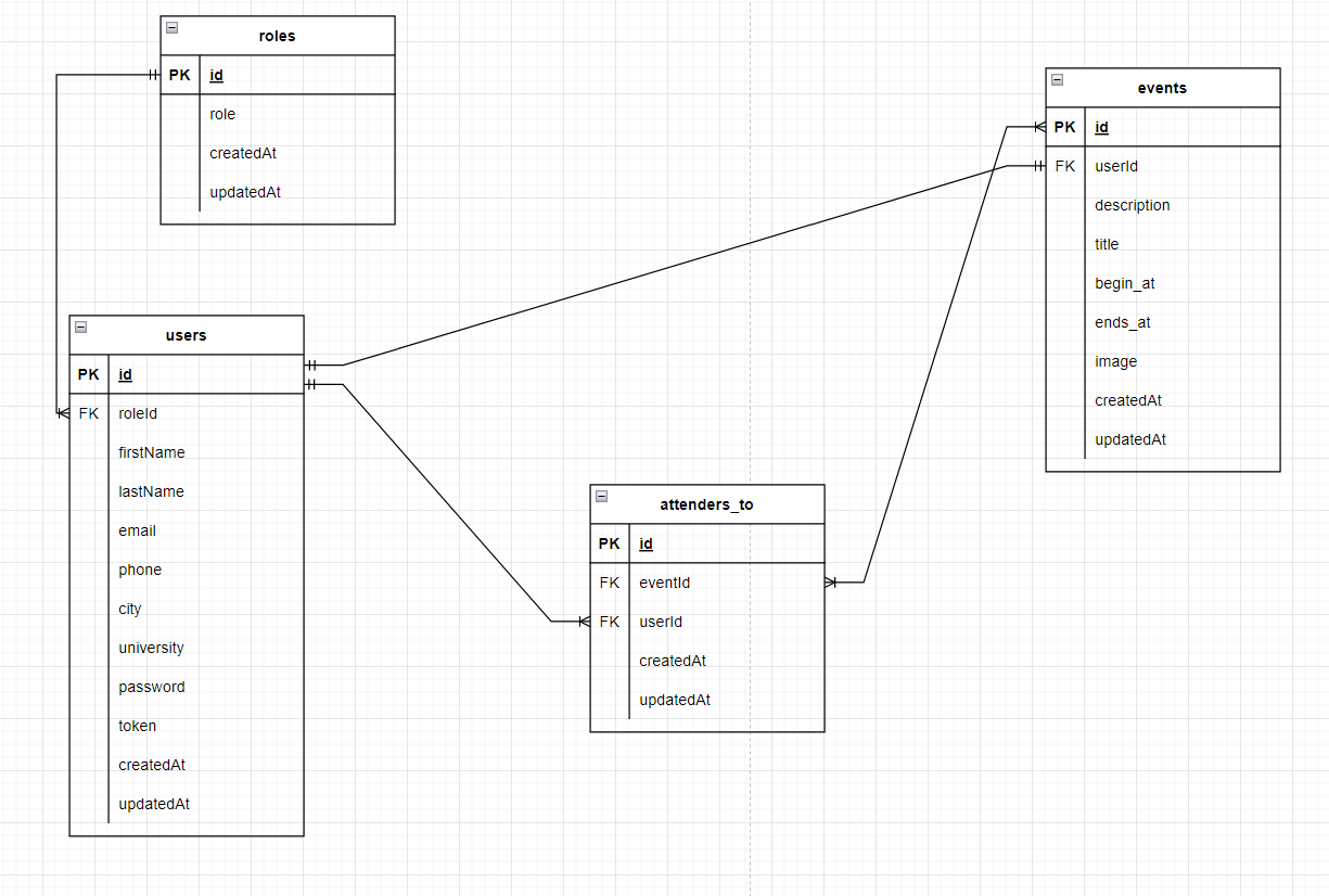 Many attendings can belong to one user.所有这些说法都是正确的。据我理解,您在描述用户和事件之间的关系时遇到了困难。本质上,你拥有的是用户和事件之间的多到多的关系。为了使多到多的关系在标准关系系统中存在,必须有一个连接表。attenders_to表在此关系中服务于联接列的用途。