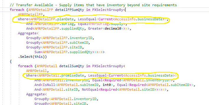 我想更改MRP异常数据(使用重新生成的MRP流程屏幕创建)切断的日期(从现在起,它似乎使用当前的业务日期)。我在MRPEngine BLC中找到了以下逻辑,我认为这就是添加OR的地方,使用自定义字段向以下BQL语句添加一个额外的日期: