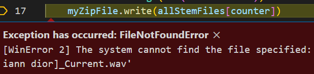 myZipFile.write('C:\\Users\\jack_l\\Documents\\Image-Line\\FL Studio\\Projects\\finished\\UPLOAD\\'+allStemFiles[counter])但是,我得到了以下错误: