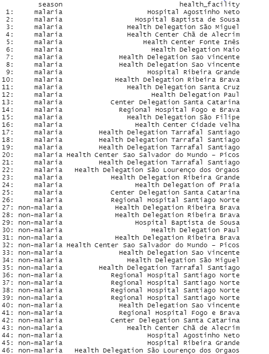 我希望我的输出只包括health_facility,它有“疟疾”和“非疟疾”在他们的季节专栏。