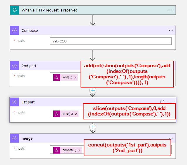 您可以在“-”附近使用片函数,然后将1添加到剩余的字符串中,将其转换为int,然后再使用compose连接器中的concat函数将其连接起来。下面是对我有用的表达。
