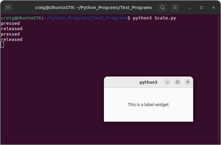 FYI,为了确认这个问题似乎与scale小部件有关,我在C中构建了一个类似的程序,测试一个scale小部件和其他小部件。同样,缩放小部件不会发出释放的信号。至少规模小部件的特性在不同的语言中是一致的。因此,它的底线似乎是,规模小部件不会发出释放的信号。我希望这些额外的信息能有所帮助。