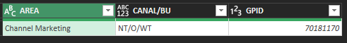 #"Change Type" = Table.TransformColumnTypes(Source,{{"AREA", type text}, {"CANAL/BU", type text}, {"GPID", Int64.Type}}),