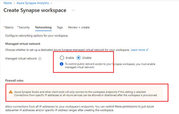 注意:如果你不启用它,你的突触工作室将无法创建一个私有端点。所以如果你在突触工作区创建过程中没有做到这一点。稍后你将无法改变这一点,你将成为重建突触工作区的一股力量。