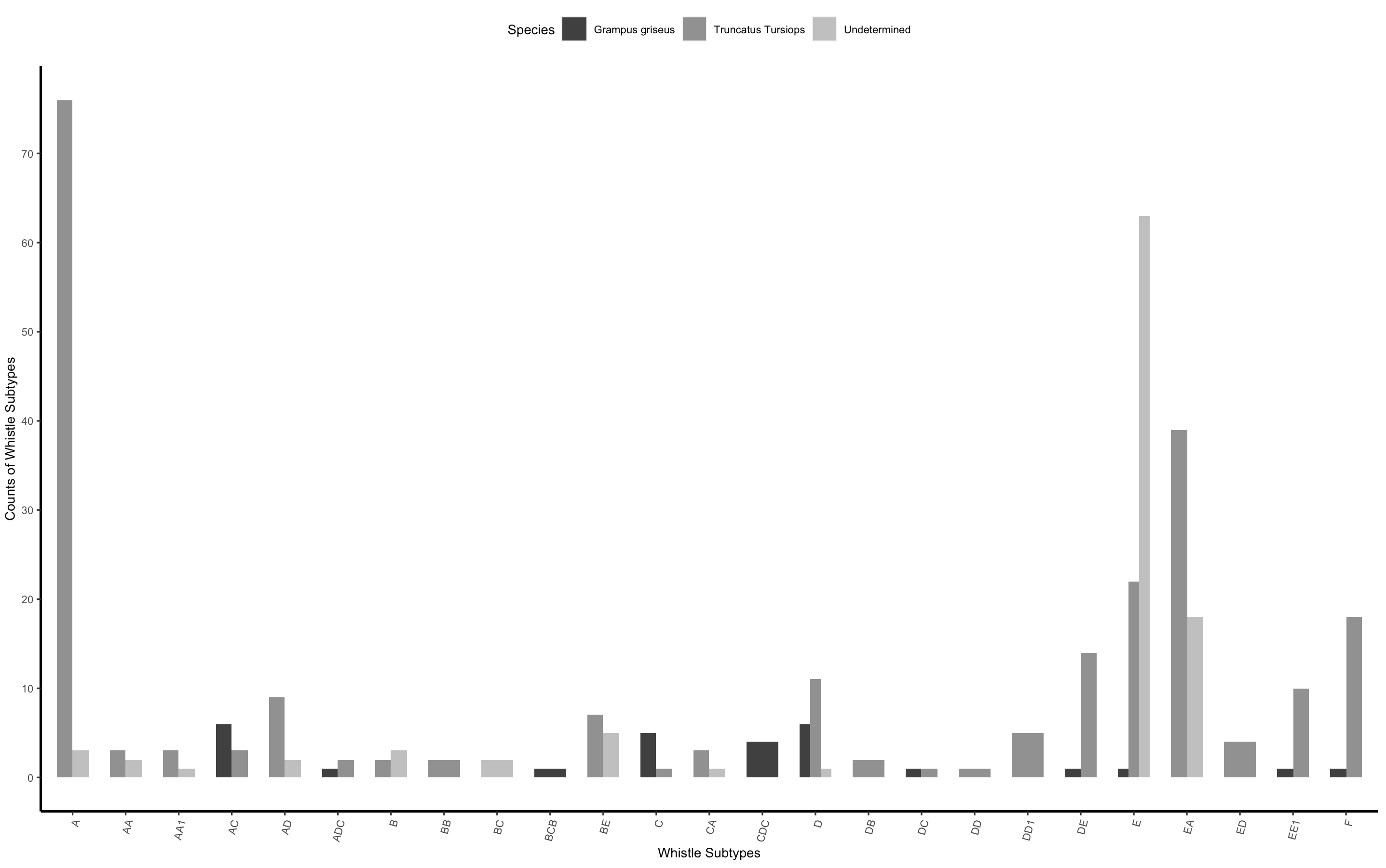Whistle_Plot + scale_y_continuous(breaks=seq(0, 80, by=10)) Barplot