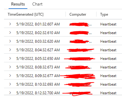 假设我的Azure订阅中有5台机器,它们每分钟向一张名为Heart节拍的桌子报告一次,所以看起来如下: