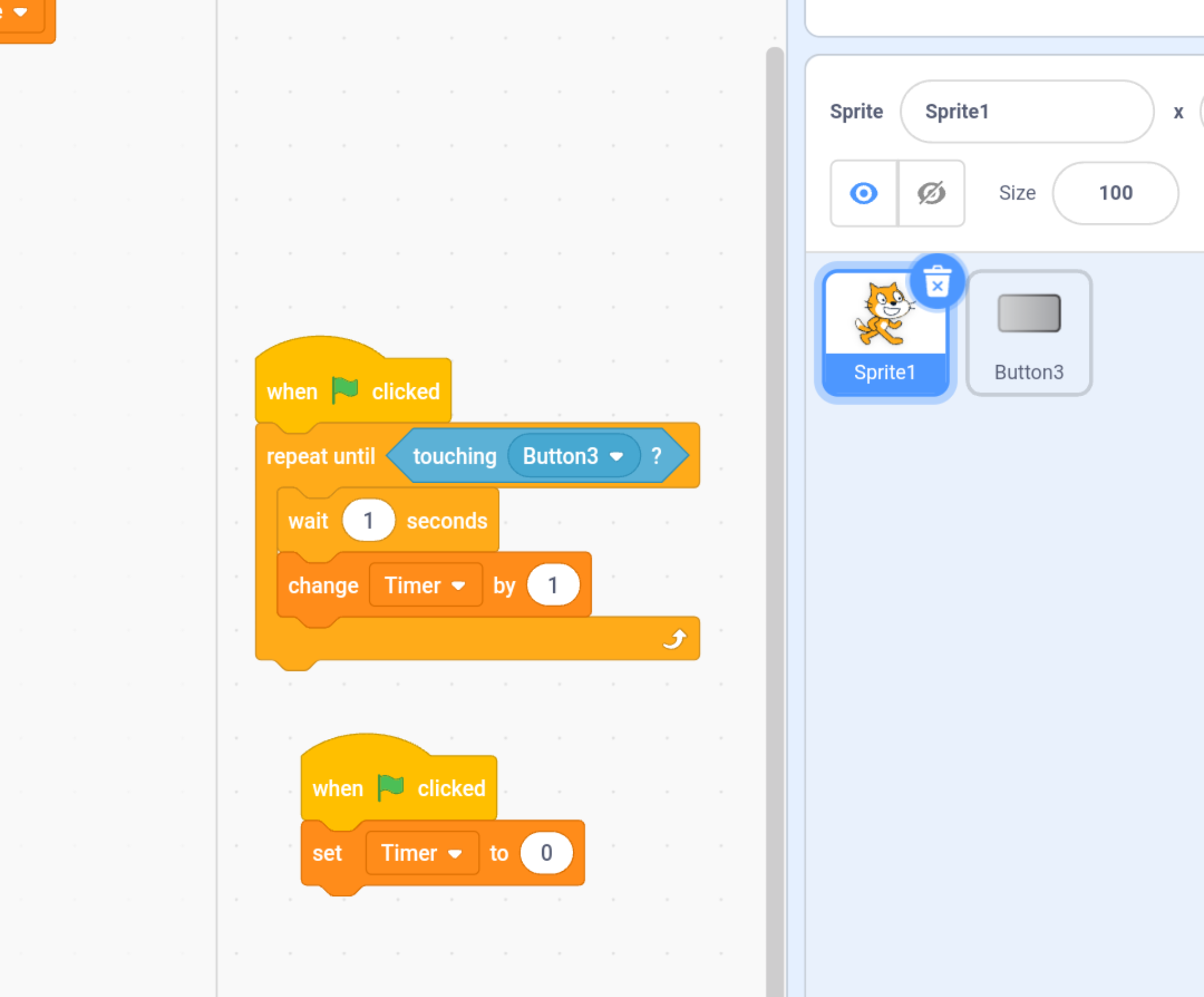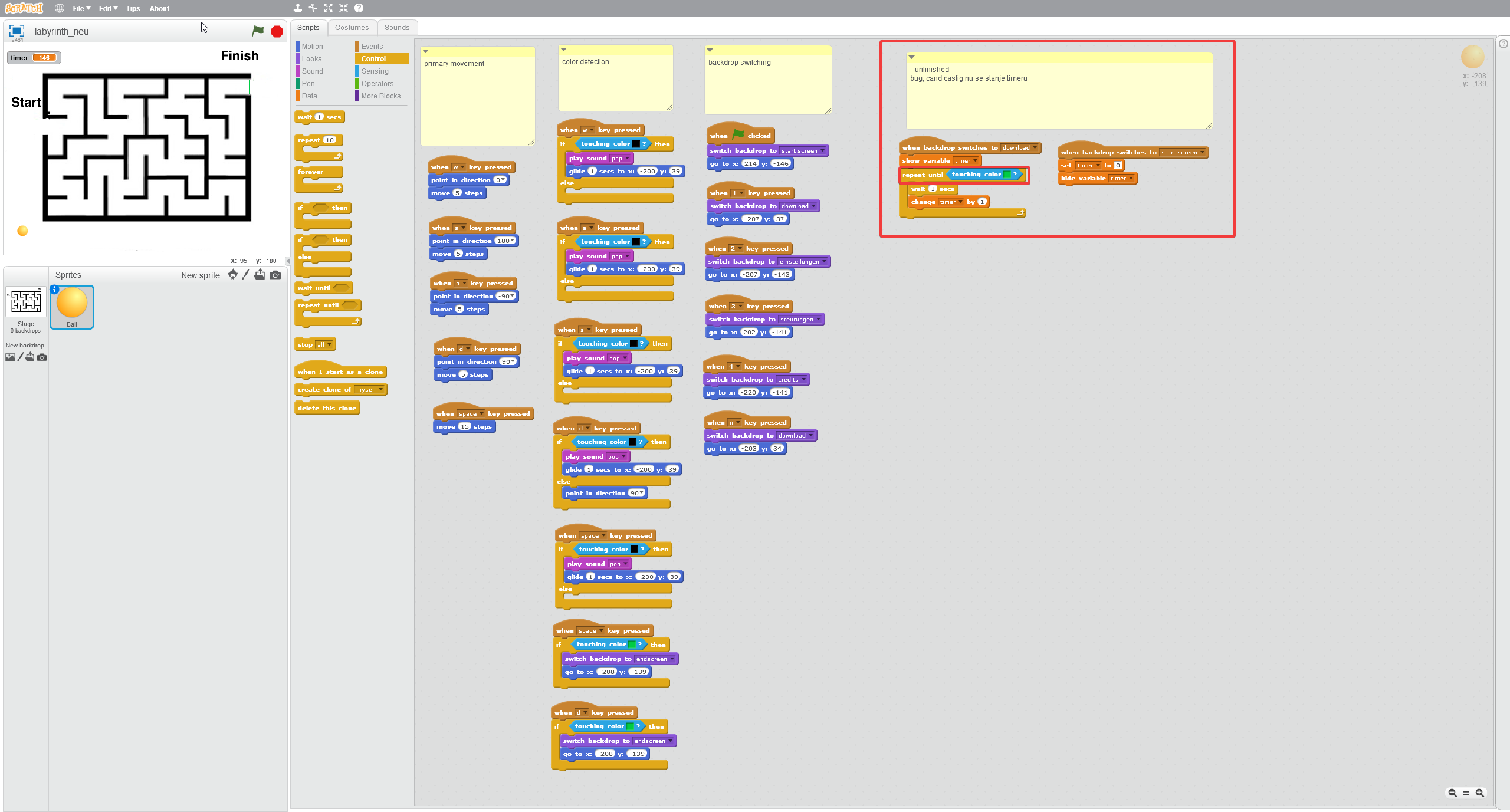 我正在做一个基本的迷宫游戏,在scratch 2,我不知道为什么计时器没有停止,当我清楚地编程它停止时,触摸颜色绿色。