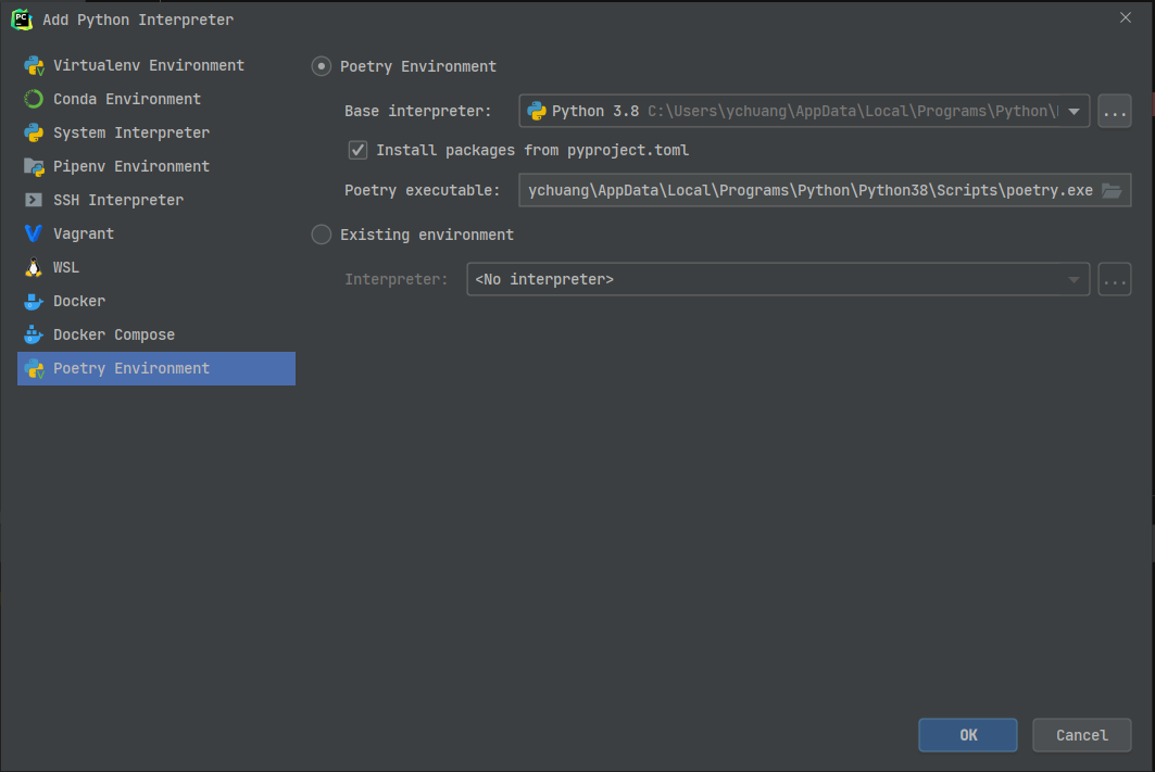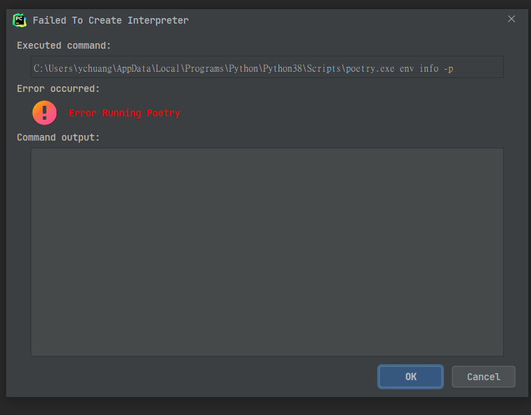 PyCharm team发布了大量来自terminalpoetry env info,它显示了本地的virtualenv是由poetry env use $(which python)创建的,然而,它返回了poetry config virtualenvs.create truepoetry config --list,它显示了通过命令poetry config virtualenvs.create truePyCharm IDE启用virtualenv创建,并试图再次添加解释器和it WORKED!!