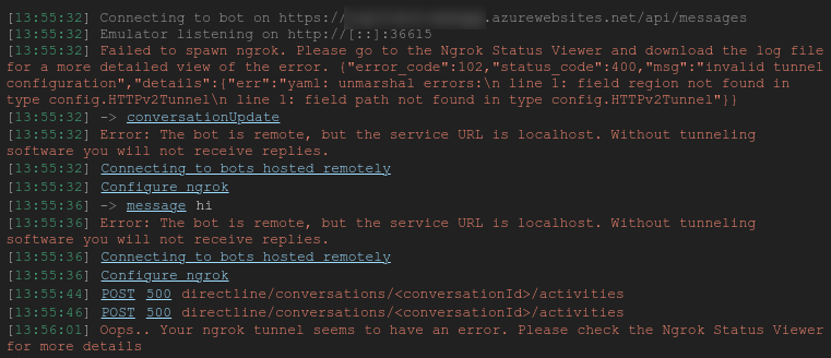 我似乎不能让Azure Bot框架仿真器与Ngork一起工作。