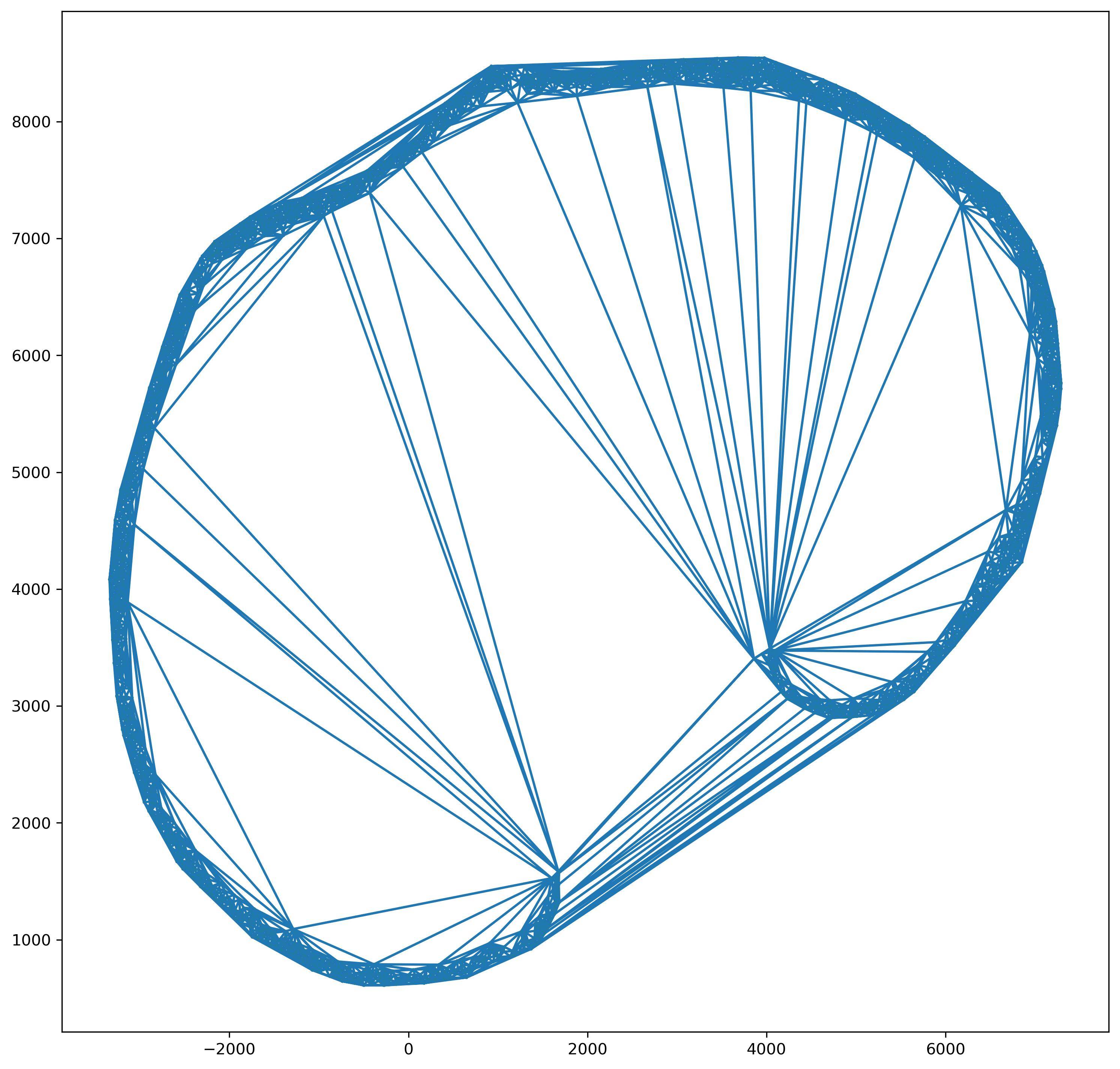 我有一组(x,y)坐标,我想使用这些(x,y)坐标创建一个图形(igraph)。首先,我从这里创建Delaunay三角形,然后使用"delaunay.simplices“查找边缘,以便在in中使用它。问题是,我的数据点几乎是在一个完整的圆圈上(这是视网膜细胞的位置)。问题是,当我绘制Delaunay图时,它会将彼此相距较远的点连接起来(请参阅附图)。我如何创建一个Delaunay三角形的方式,只是点是相互联系的?换句话说,我需要去除整个圆圈(视网膜)的边缘。数据点样本: