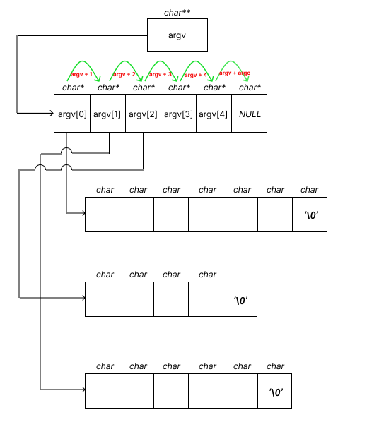 换句话说,argv是一个指针,指向数组的第一个元素,其元素类型为char*。此外,数组的每个元素argv[i] (具有char*类型的元素)本身指向一个字符,该字符是以空结尾的字符串的开始。也就是说,每个元素argv[i]指向数组的第一个元素,其元素类型为char。