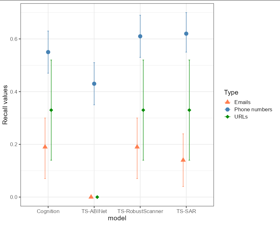 0.52,0.52,0,0.52))它由图像ML模型中的4‘文本检测结果组成。recall列根据检测到的文本的type (电话号码、电子邮件或URL)为每个模型提供召回度量值。ub和lb列具有95%置信区间召回的下限值。