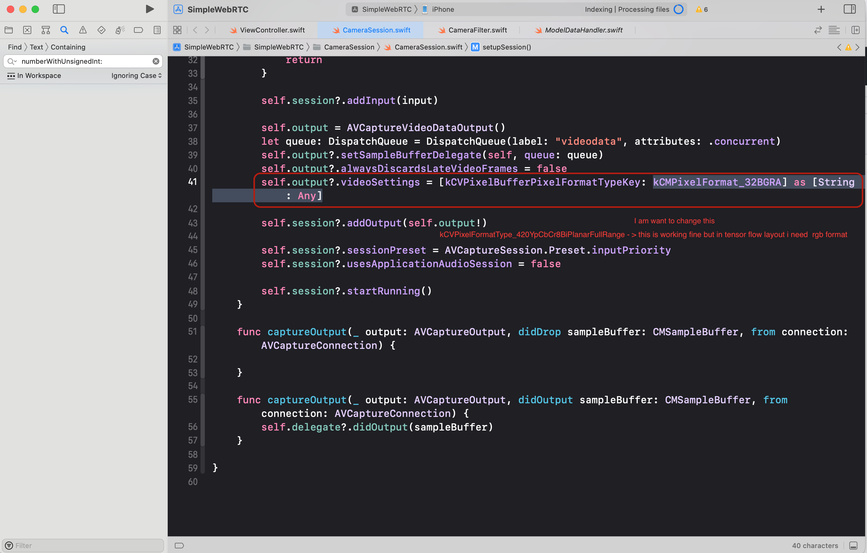 但是我需要保留这个视频设置,当捕获输出方法调用该时间时,我希望将示例缓冲区kCVPixelFormatType_420YpCbCr8BiPlanarFullRange转换为kCMPixelFormat_32BGRA。