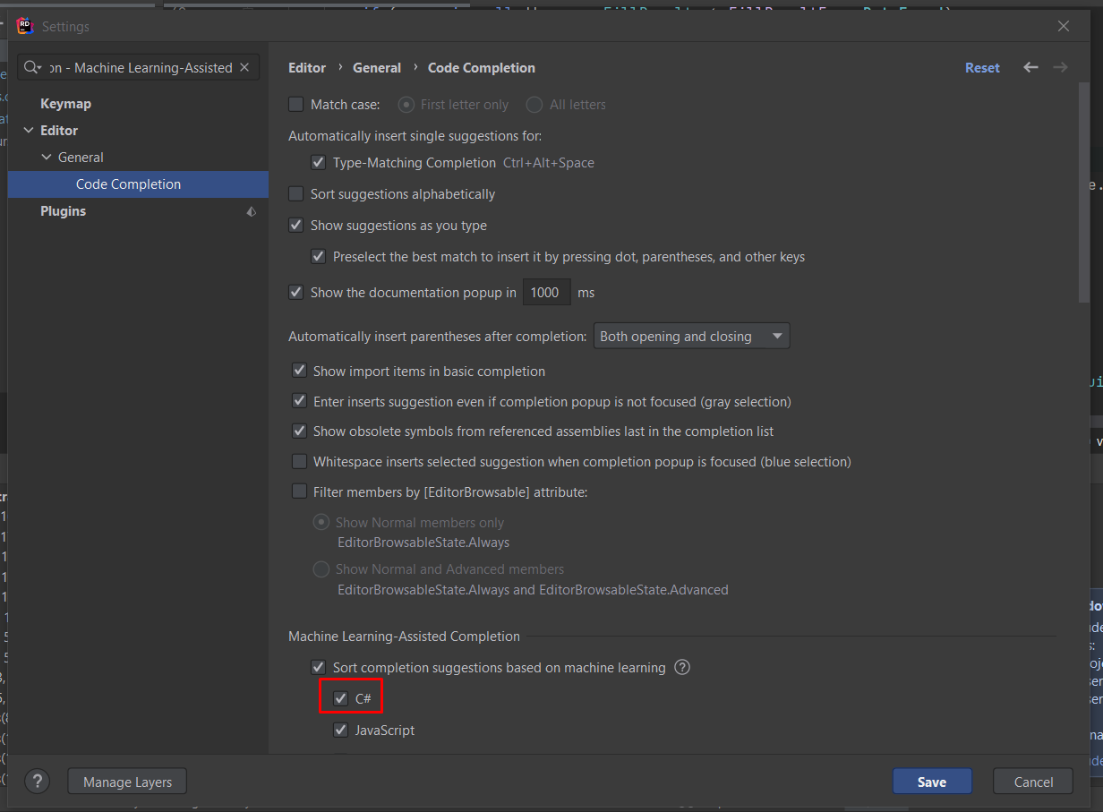 如果您使用的是Rider 2021.3或2022.1,您应该能够启用Machine Learning-Assisted Completion - C#。通过在下面的设置中勾选C#来完成它:Preferences | Editor | General | Code Completion - Machine Learning-Assisted Completion - C#