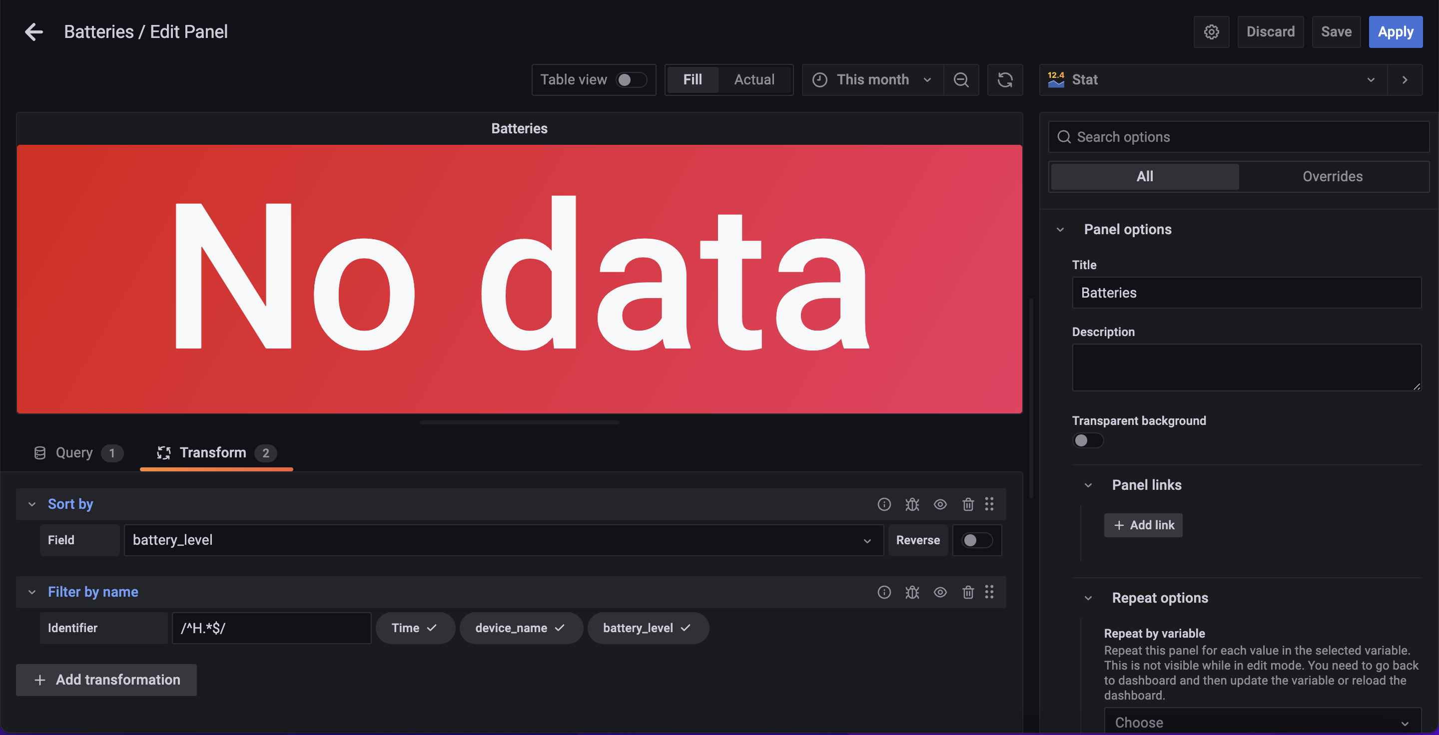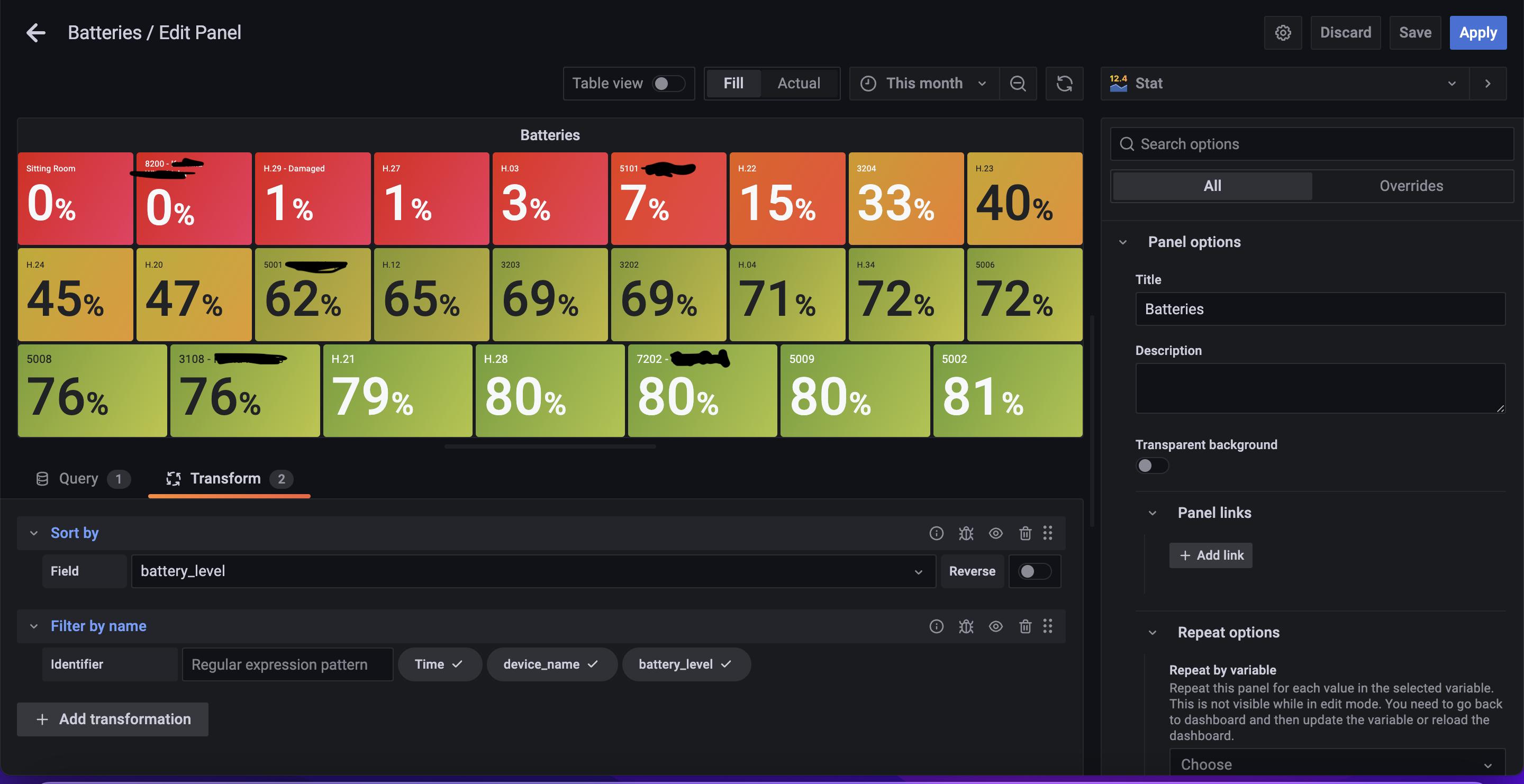 这些是iPads和手机,他们的电池水平监测在格拉法纳。我如何过滤它,所以它将只向我显示iPads (从设备名“H”开始)。当我尝试像"/^H.$/“这样的regex时,它不起作用。