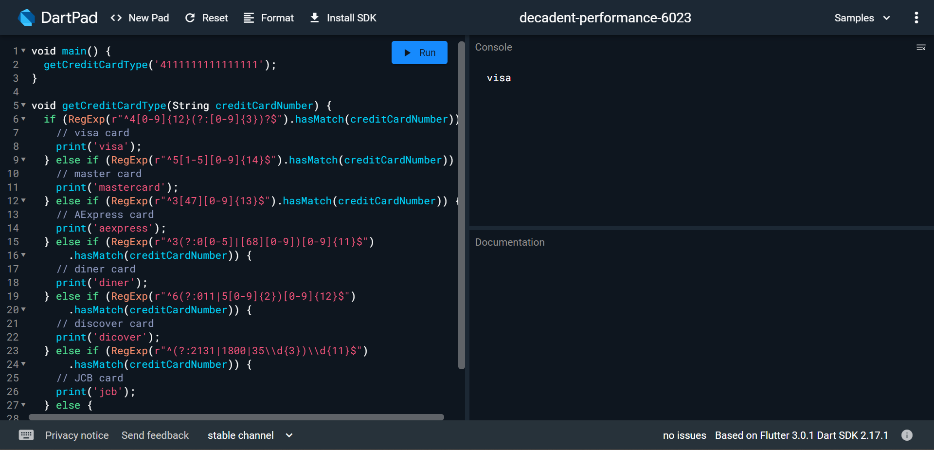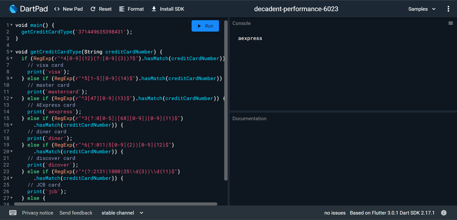 } else if (RegExp(r"^3[47][0-9]{13}$").hasMatch(creditCardNumber)) {