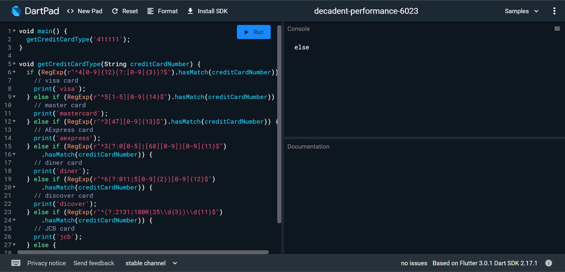 我尝试了您写下的函数,看起来regex模式只识别信用卡的完整/完整格式。因此,它是“验证正则表达式”而不是“分类正则表达式”。