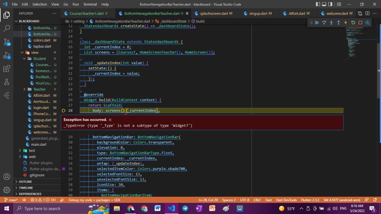 List<Widget> screens = [CoursesT(), HomeScreenTeacher(), HomeScreen()];https://stackoverflow.com/questions/72357246