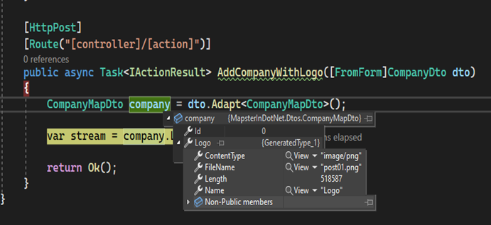 at MapsterInDotNet.Controllers.CompaniesController.AddCompanyWithLogo(CompanyDto dto) in C:\Users\Mohsen\source\repos\UseMapsterInDotNet\MapsterInDotNet\MapsterInDotNet\Controllers\CompaniesController.cs:line 52