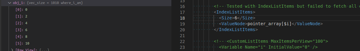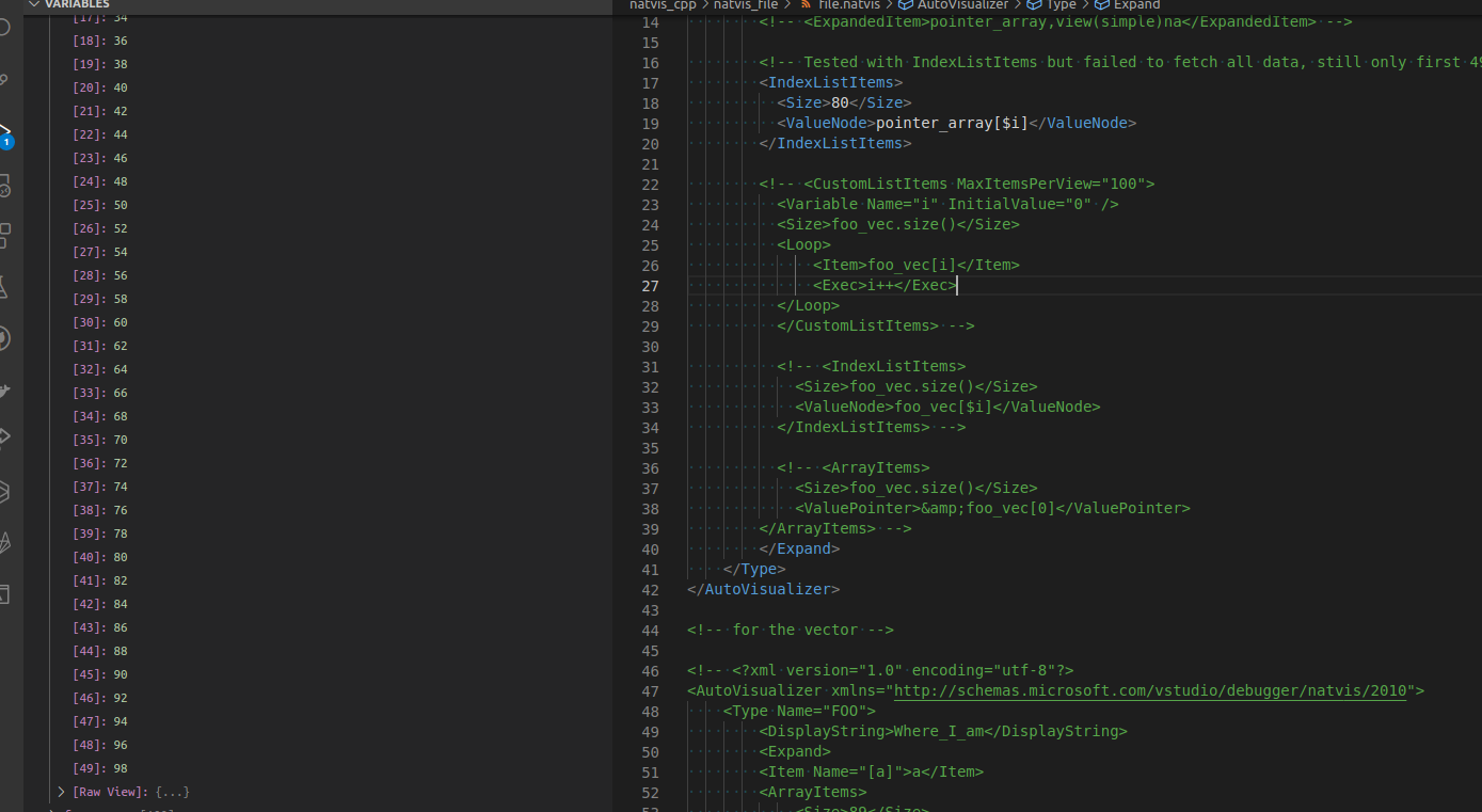 "showDisplayString": true,为了更好地理解,我在这里给出了输出的截图,在natvis文件中,我使用了IndexListItems,并给出了大小80来查看索引0到79之间的值,但显示的最后一个值来自索引49。