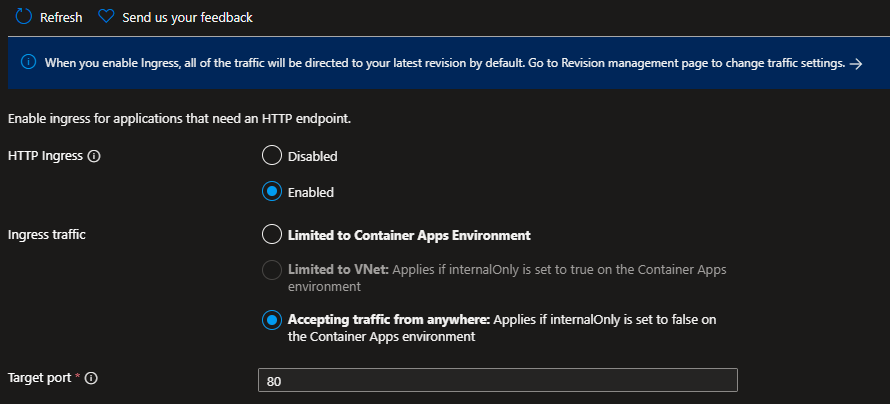 如果您的Container的HTTP入口设置为“已启用”,平台将尝试在指定的目标端口(默认情况下为80)上对其进行ping。如果平台不能成功地运行它,它将被认为是“不健康的”,并将被重新启动。请参考Azure容器应用程序中的健康探针了解默认的运行状况探测以及如何指定您自己的设置。