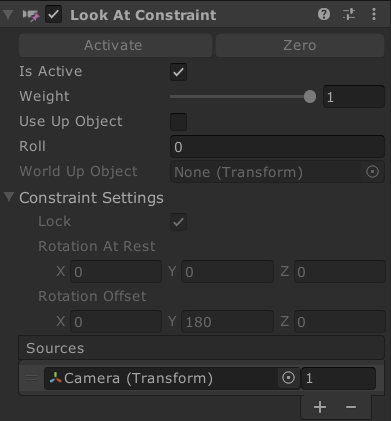 最后,我建议使用Look At Constraint将画布和视图与照相机相匹配。插入相机作为源,并修复约束设置,如下所示。