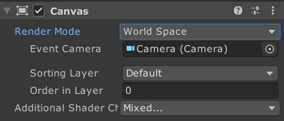 要解决这个问题,您需要一个附加到对象的免费画布。这张帆布应该调整到物体的尺寸,并且总是看着相机。为此,首先创建一个画布并将RenderMode设置为World Space,请记住,您已经输入了事件照相机引用。