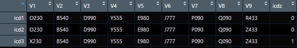 data <- as.data.frame(rbind(icd1, icd2, icd3))我需要做的是创建一个名为"ICD_Z“的新列,检查这9个ICD-10列的每一个代码,看看它们中是否有一个以字母Z开头,所以如果是这样的话,我创建的列将收到1,否则,0。但只有当这9列都没有以字母O开头的ICD-10代码时,它才能接收到1。