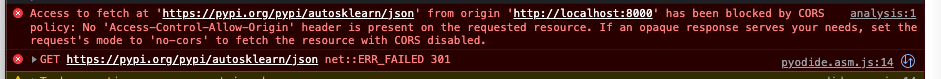 我想通过Pyodide在浏览器中使用"autosklearn“执行ML。我想我应该加载micropip,然后使用它从PyPI加载自动学习。但是我得到了一个CORS错误,并且不确定我应该如何去做。Pyodide和PyPI不应该有任何CORS限制,对吗?