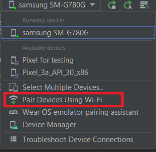 因为你有一个Android 11手机,你可以使用“配对设备使用Wifi”。以这种方式,你可以运行应用程序到你的手机从你的电脑。