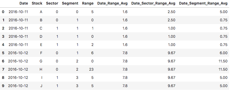 res = pd.DataFrame({'Date': {0: '2016-10-11', 1: '2016-10-11', 2: '2016-10-11', 3: '2016-10-11', 4: '2016-10-11',5: '2016-10-12',6: '2016-10-12',7: '2016-10-12',8: '2016-10-12',9: '2016-10-12'}, 'Stock': {0: 'A', 1: 'B', 2: 'C', 3: 'D', 4: 'E', 5: 'F', 6: 'G', 7: 'H',8: 'I', 9:'J'}, 'Sector': {0: 0,1: 0, 2: 1, 3: 1, 4: 1, 5: 0, 6:0, 7:0, 8:1, 9:1}, 'Segment': {0: 0, 1: 1, 2: 1, 3: 1, 4: 1, 5: 1, 6:2,7:2,8:3,9:3}, 'Range': {0: 5, 1: 0, 2: 1, 3: 0, 4: 2, 5: 6, 6:0, 7:23, 8:5, 9:5}, 'Date_Range_Avg':{0: 1.6, 1: 1.6, 2: 1.6, 3: 1.6, 4: 1.6, 5: 7.8, 6: 7.8, 7: 7.8, 8:7.8, 9: 7.8}, 'Date_Sector_Range_Avg':{0: 2.5, 1: 2.5, 2: 1, 3: 1, 4: 1, 5: 9.67, 6: 9.67, 7: 9.67, 8: 9.67, 9: 9.67}, 'Date_Segment_Range_Avg':{0: 5, 1: 0.75, 2: 0.75, 3: 0.75, 4: 0.75, 5: 6, 6: 11.5, 7: 11.5, 8: 5, 9: 5}})这就是它的样子: