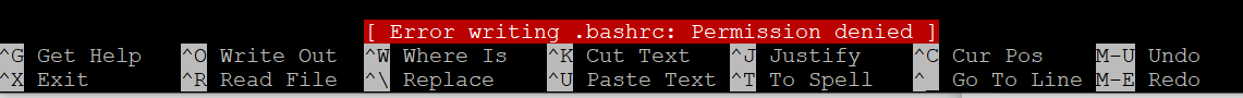 您正在尝试在根目录/中创建一个新文件,普通用户在该文件中没有写入权限。您必须编辑的文件位于您的主目录中,因此请用以下方式打开编辑器:nano ~/.bashrc