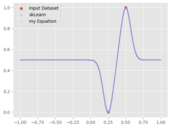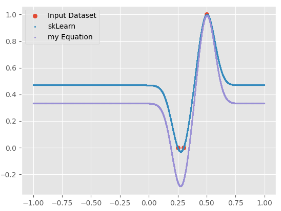 out = out + (vect.y - mean) * math.exp(-(vect.x - x) ** 2 * gamma)当我只做了两个点的间隔,我的方程与skLearn报告的svr.predict相匹配。
