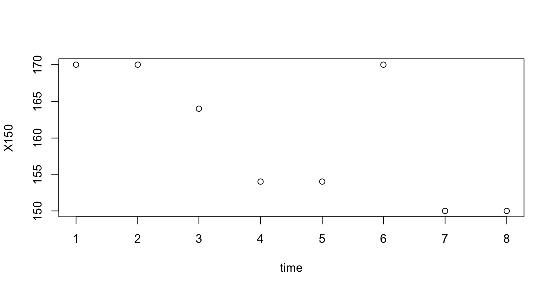 plot(df$time, df$X150, xlab = "time", ylab = "X150")输出: