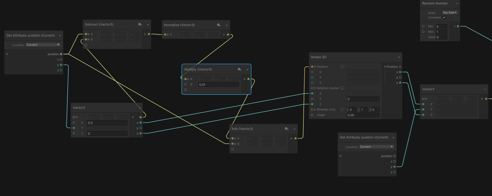 我尝试将以下节点连接到“旋转3D”节点的“旋转中心”的"X“变量: