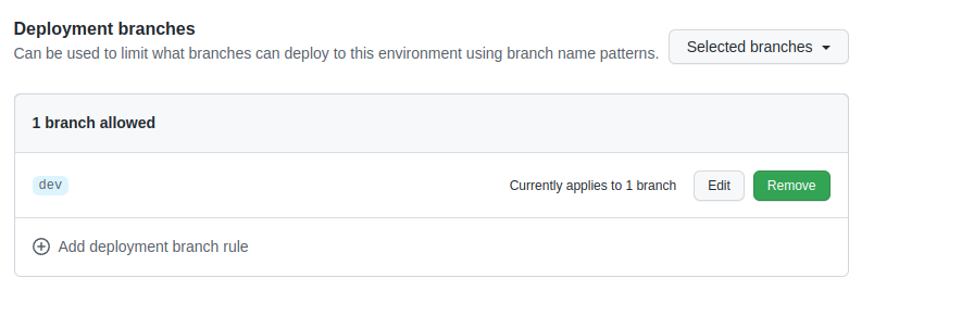 我已经设置了一个Github操作工作流。其中,当拉请求从特性合并到dev分支时,我希望触发作业。我用了一个保护规则来使用Github操作环境。Github操作正在抛出错误消息分支,由于环境保护规则,不允许将“功能”部署到dev。
