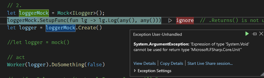 //loggerMock.SetupFunc(fun lg -> lg.LogError(It.IsAny<string>())) |> ignore // .Returns() is not usable