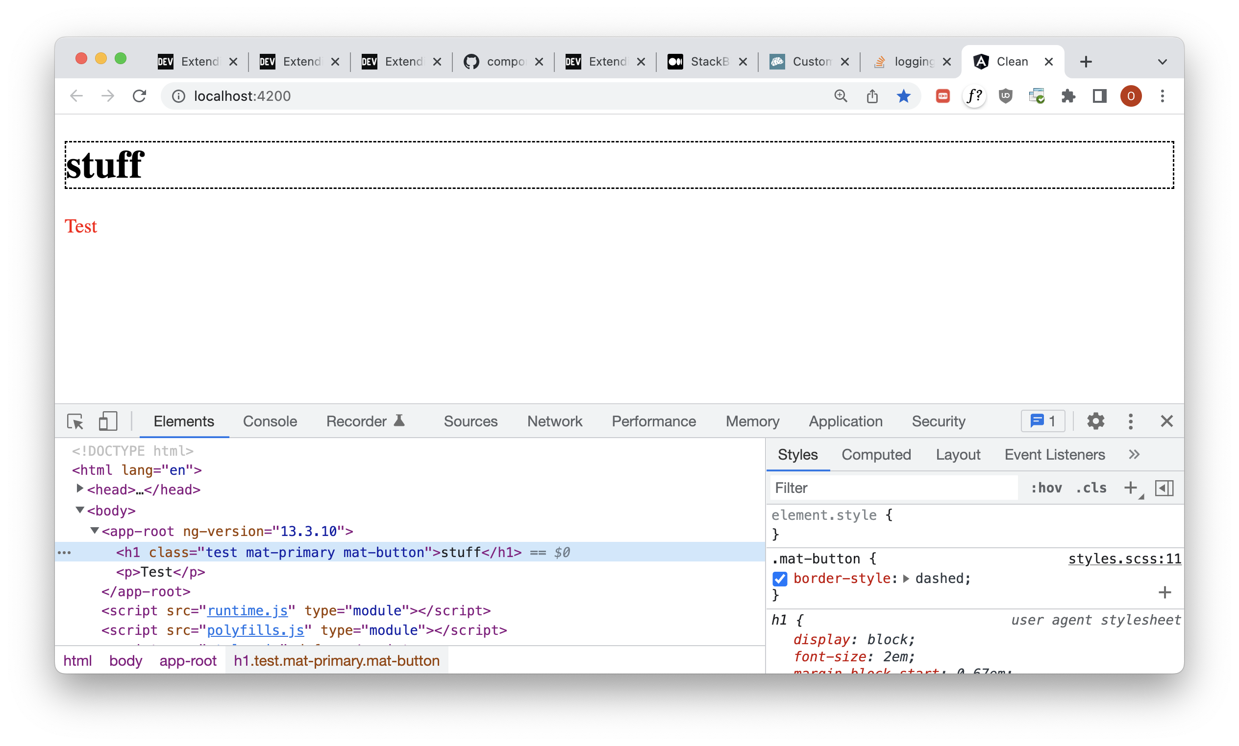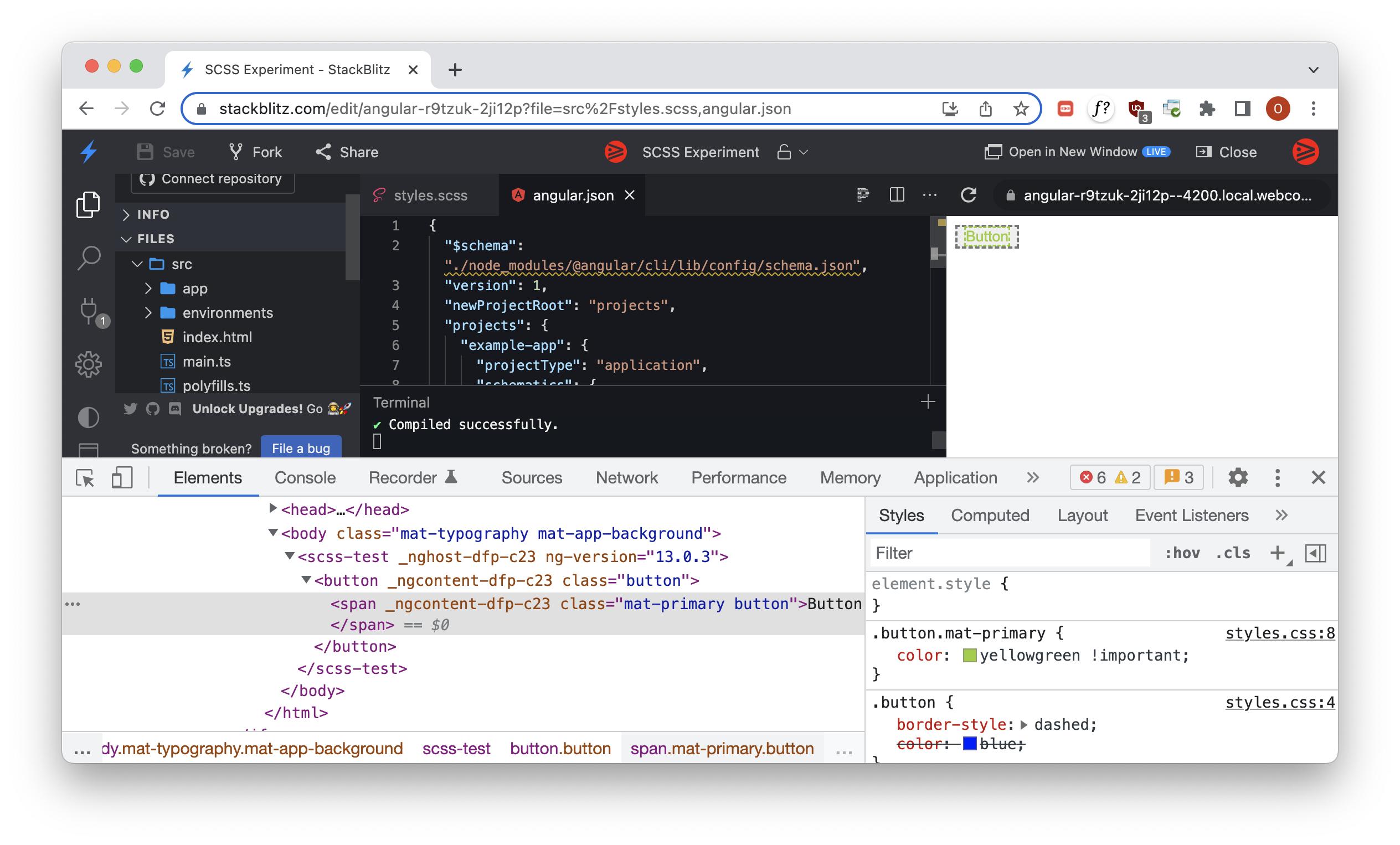 在这个web容器堆栈闪现演示中,如果我们单击Chrome工具中呈现的按钮元素,我们可以看到生成的styles.css。