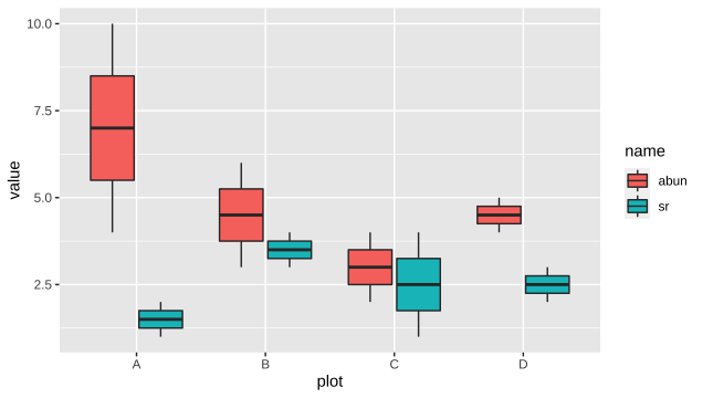 boxplot(abun~Plot,data=factors)但这是两个不同的地块,底部是地块(A,B,C,D),盒子代表sr或abun。但是我希望有一个图,在下面有四个图(A,B,C,D),然后沿着y轴并排排列每幅图的物种丰富度和丰度。这个是可能的吗?谢谢你的帮助!