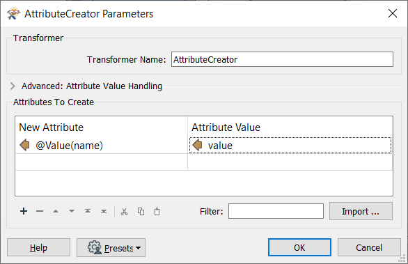 只需添加一个AttributeCreator,其中属性名来自" Name“属性,而值来自" value”属性。请注意符号@Value(attrName):