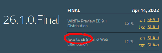 您很可能打算选择上面部分提供的wildfly-preview-26.1.0.Final下载链接,具体标记为Preview。这个服务器是Jakarta 9服务器,它是第一个带有Jakartified名称的服务器(即jakarta.*而不是javax.*),并附带了JSF3.0 (和Servlet5.0)。Jakarta 10的实现将由即将推出的WildFly 27.x提供,目前仍处于Alpha阶段。它将提供面4.0 (和Servlet6.0)。